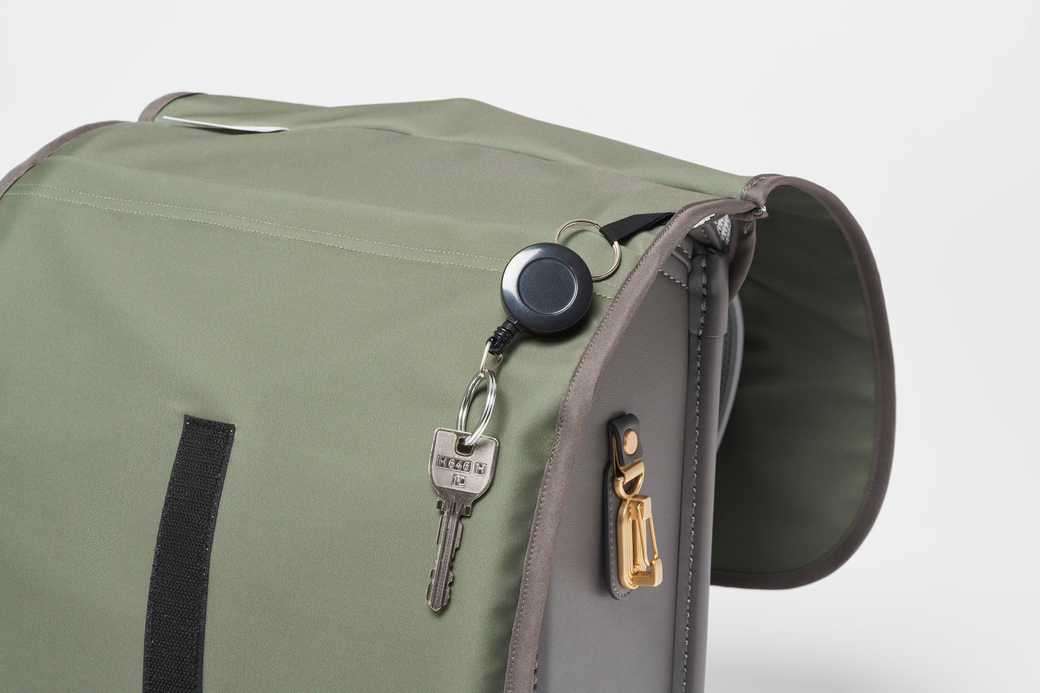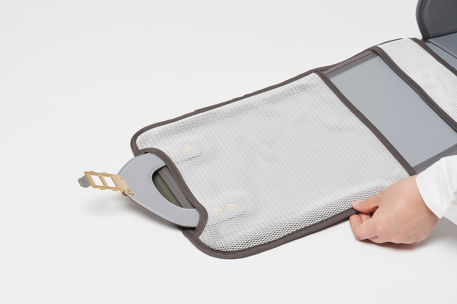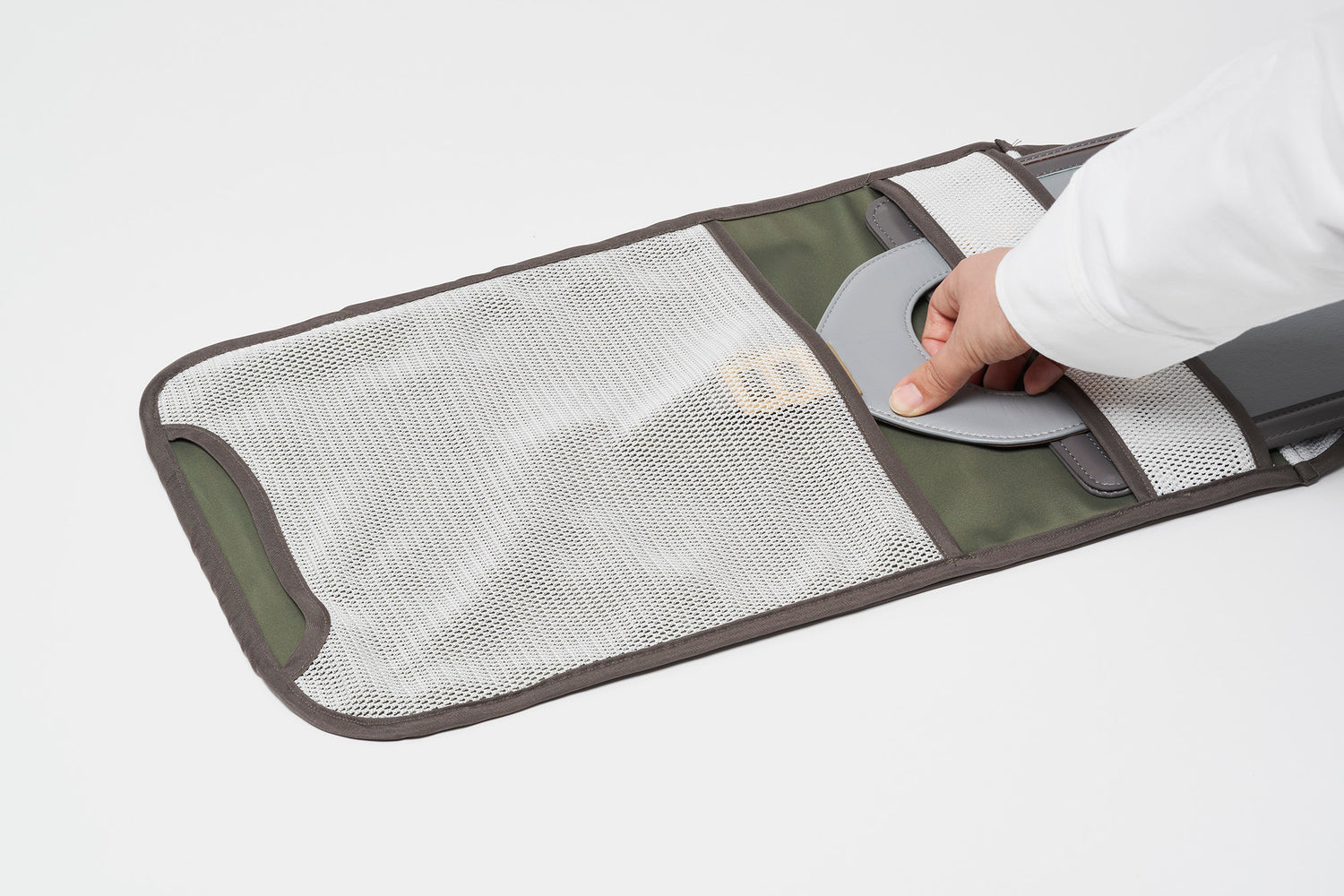 フタの内側にループがあり鍵などをつけることができます。また、裏面はメッシュ加工にすることで軽量化と通気性を保ちつつ、ランドセル内装の時間割入れも隠れず見ることができます。