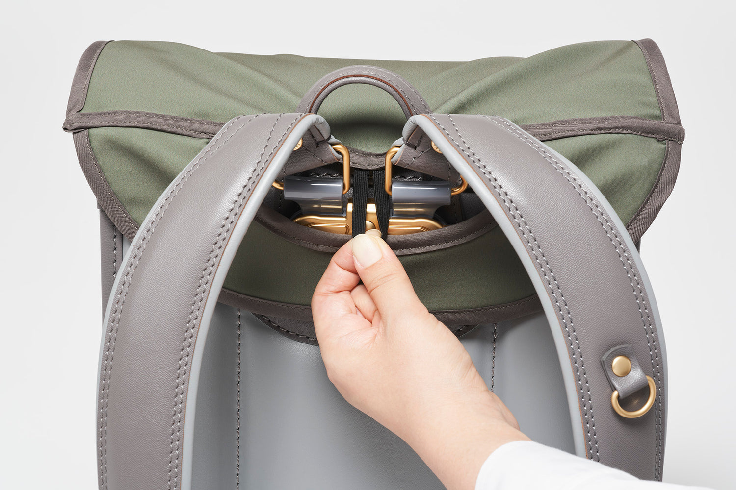 ① メッシュの帯にランドセルのかぶせ(フタ)部分を通します。