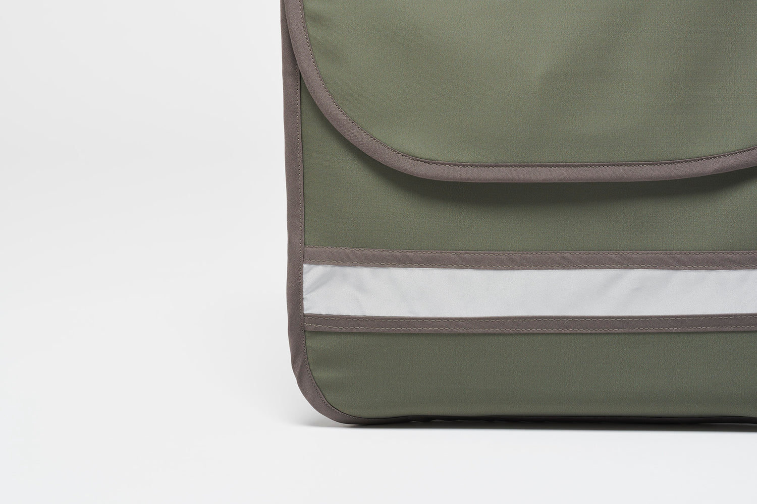両手を塞いでいたたくさんの荷物がスッキリ入る大容量ポケットにしました。傘を持つ雨の日も安心です。暗い夜道で光る反射テープもつけました。